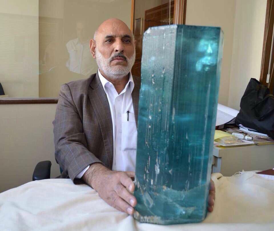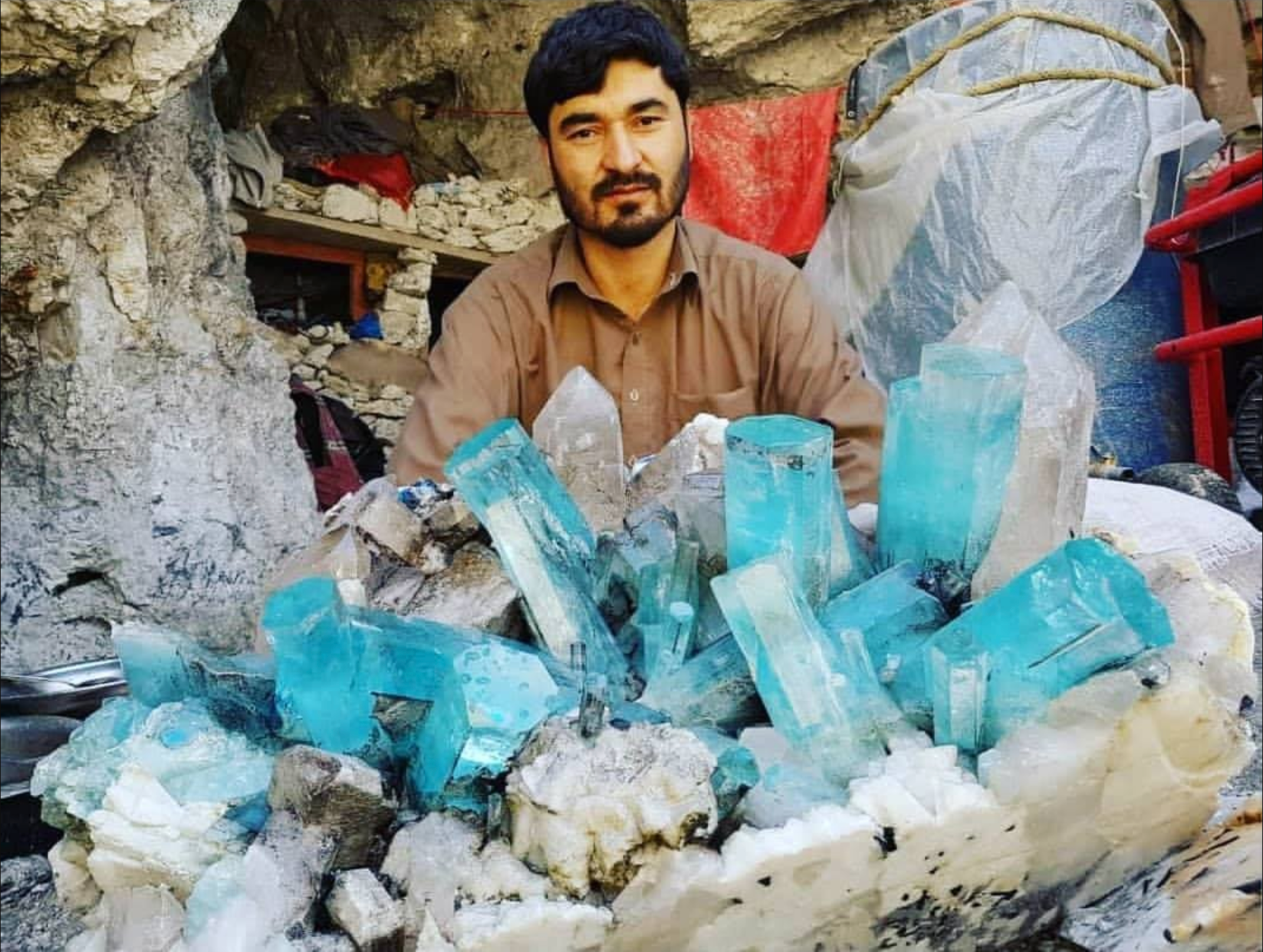 Aquamarine crystals can grow to an astounding size. The largest ever recorded weighed 244 lbs. On the top left is the Dom Pedro of Brazil before it was cut into the largest cut gem of aquamarine in the world, now on display in the Smithsonian Museum in Washington, DC. On the bottom left is a miner in the mountains of Pakistan showing off another remarkable cluster.
